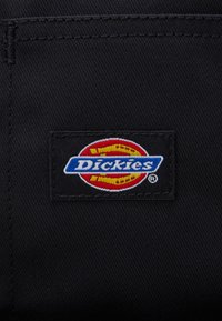 Sac à dos noir Dickies avec bretelles rembourrées, poche zippée avant, poche latérale ouverte et poignée supérieure sur un fond clair uni.