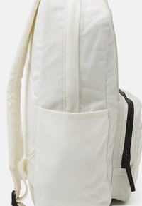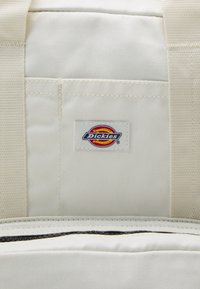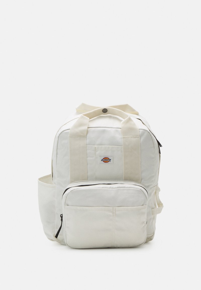 Sac à dos Dickies blanc avec poche zippée à l'avant, poche latérale, bretelles doubles crème et écusson logo sur le compartiment principal.