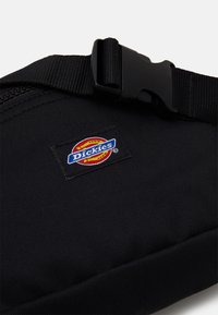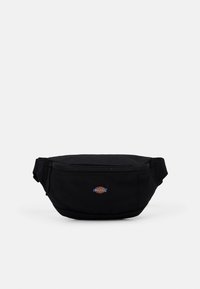 Sac banane en tissu noir avec poche zippée à l'avant et patch logo Dickies, sangle ajustable, présenté sur un fond blanc uni.