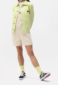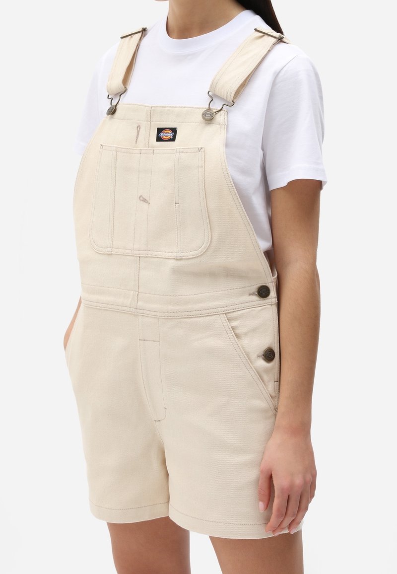 Salopette en denim beige avec bretelles réglables, poches avant et détails de boutons sur les côtés. Associée à un t-shirt blanc uni.