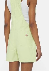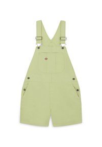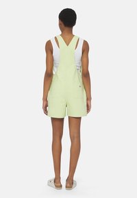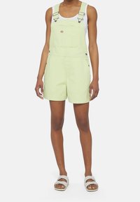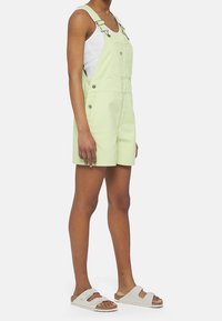 Salopette en denim vert clair avec bretelles ajustables et poches avant, portée avec un débardeur blanc et des sandales claires.