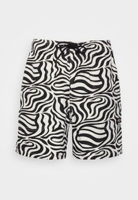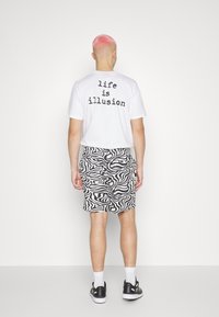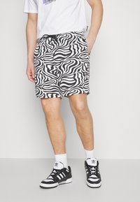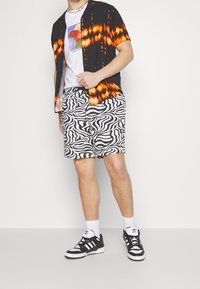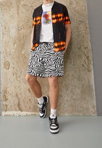 Personne portant un short à imprimé zèbre noir et blanc, un t-shirt blanc avec un graphique, une chemise tie-dye noire et orange, et des baskets Adidas noires avec des chaussettes blanches.