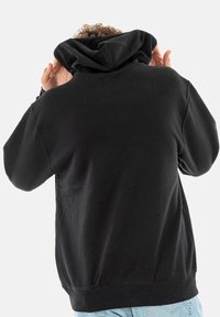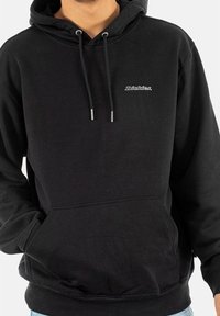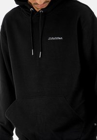 Personne portant un sweat à capuche Dickies noir avec poche avant et cordons, visible du cou à la taille sur un fond blanc.