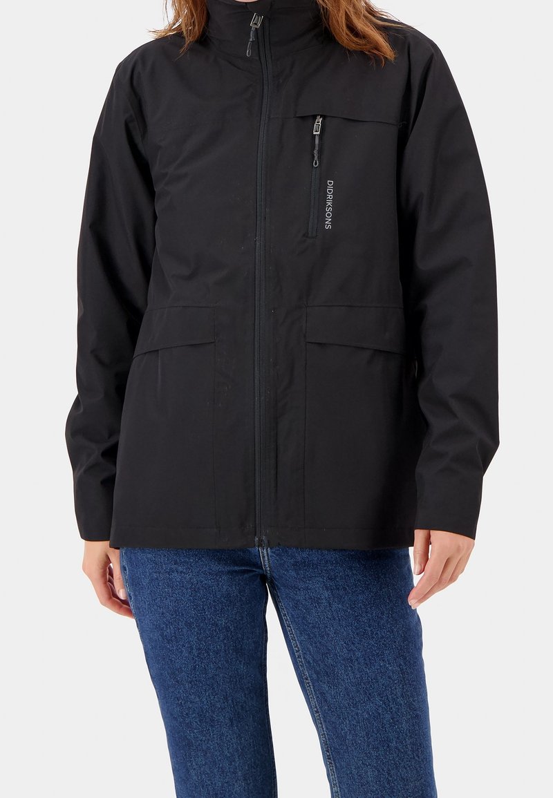 Femme portant une veste noire zippée avec des poches sur la poitrine et la taille, accompagnée d'un jean bleu, debout devant un fond uni.