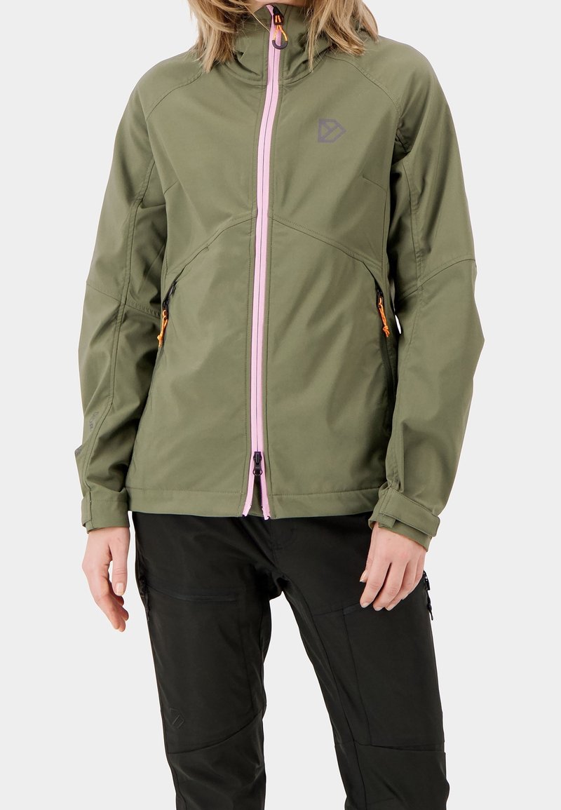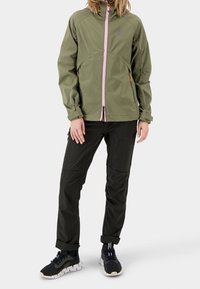 Personne portant une veste vert olive avec une fermeture éclair rose à l'avant et un pantalon noir, debout devant un fond clair uni.