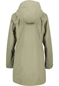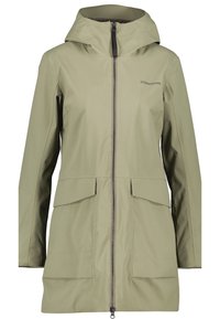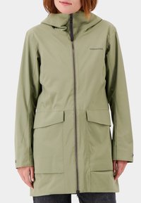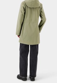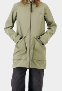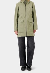 Personne portant un imperméable à capuche zippé vert clair avec poches latérales et pressions aux poignets, associé à un pantalon gris foncé.