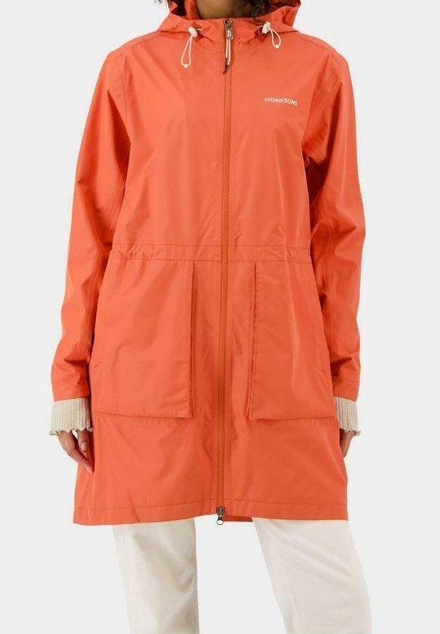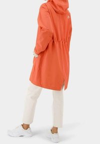 Imperméable à capuche orange avec fermeture éclair à l'avant et grandes poches, porté sur un pantalon blanc et manches de pull côtelé beige visibles aux poignets.