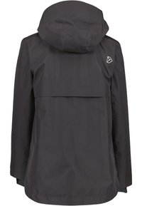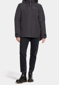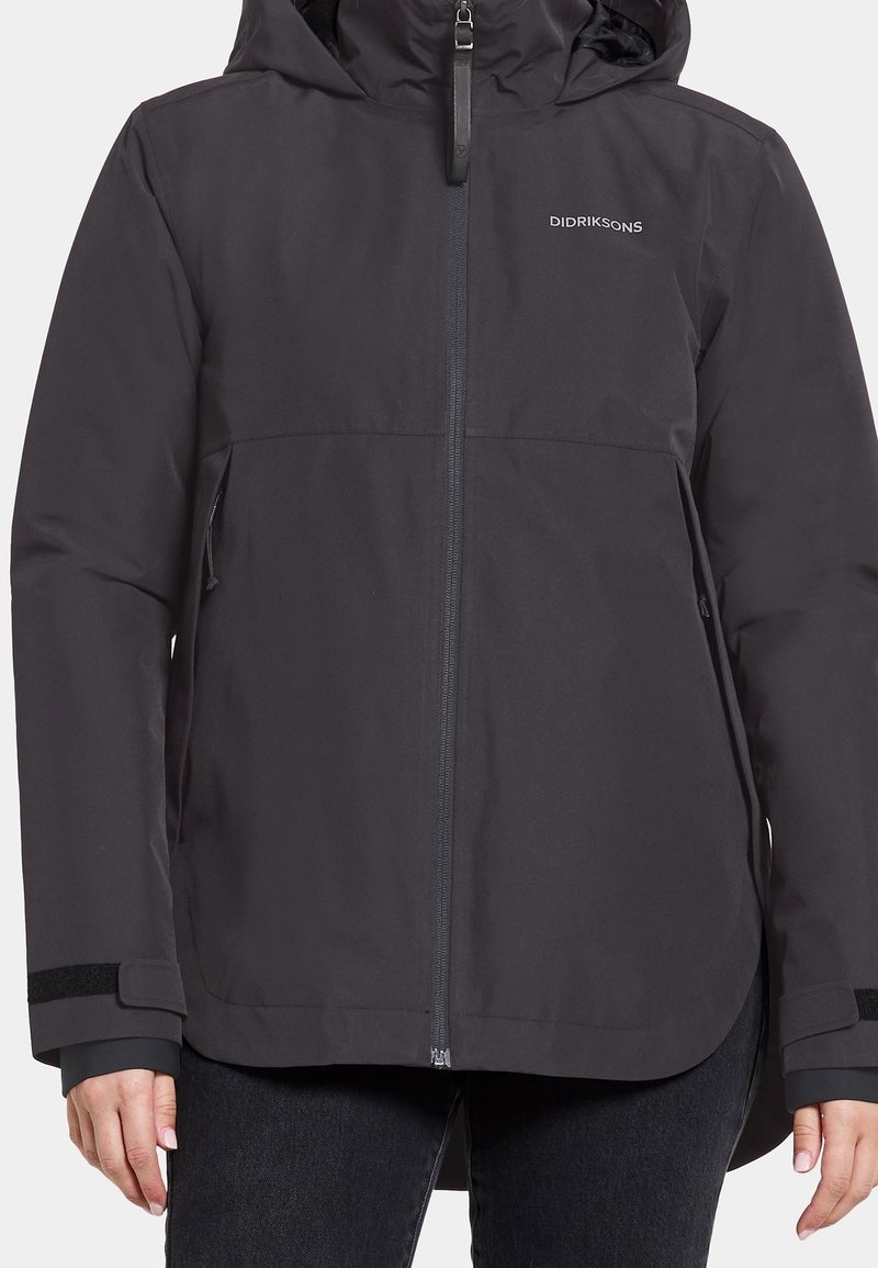 Veste noire à capuche Didriksons avec fermeture éclair frontale, poignets en Velcro et poches latérales portée avec un pantalon noir.