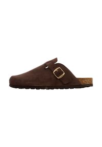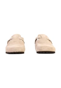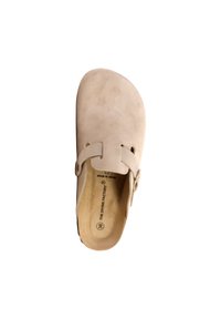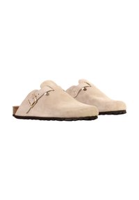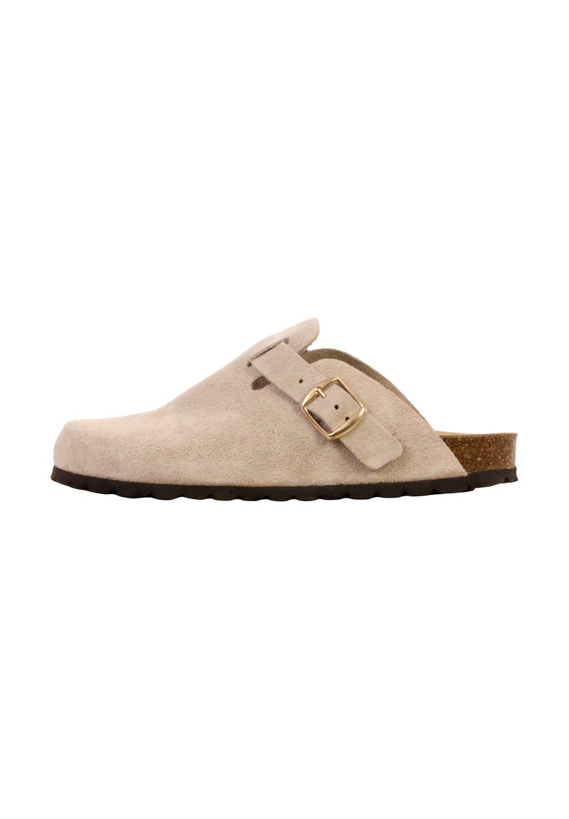 Sabot beige en daim à enfiler avec bride réglable à boucle dorée et semelle intérieure en liège profilée, doté d'une semelle noire texturée.