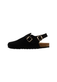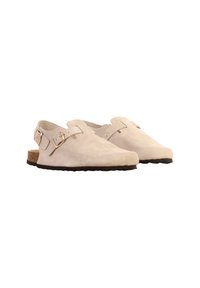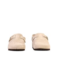 Sabot en daim beige avec boucles dorées réglables, bride arrière ouverte et semelle intérieure en liège.