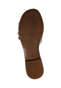 Sandale plate marron avec des brides croisées en cuir blanc et une petite boucle décorative en strass près de la zone des orteils, vue de côté.