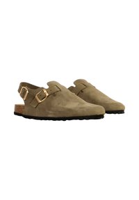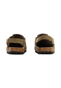 Sabot en daim vert olive avec deux lanières à boucles dorées, talon ouvert, semelle intérieure en liège et semelle extérieure noire texturée.