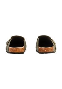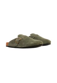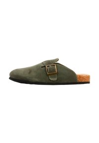 Mule en daim vert olive à enfiler, avec une boucle latérale réglable en laiton et une semelle intérieure en liège sur une semelle noire.