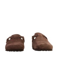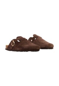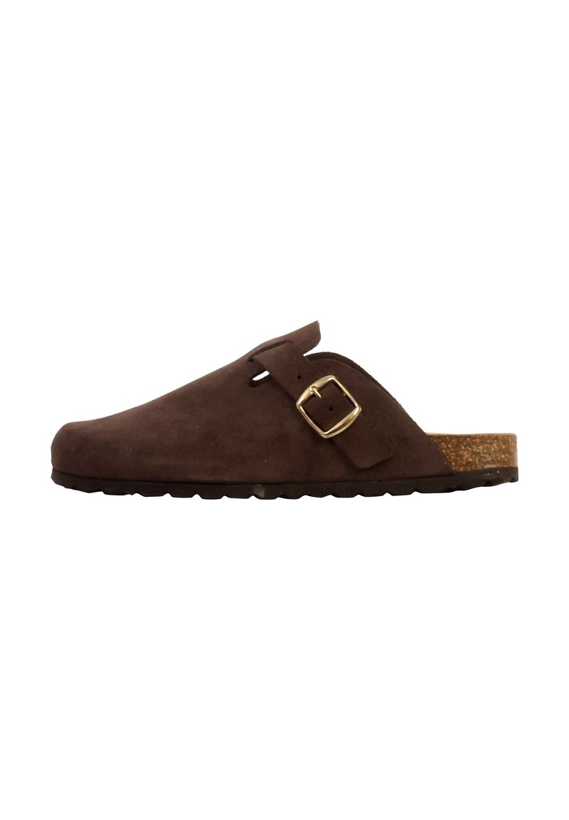 Sabot marron en daim à enfiler avec semelle en liège et bride réglable avec boucle dorée, montré de profil sur fond blanc.