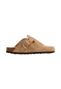 Sabot beige en daim à enfiler avec bride réglable à boucle dorée, semelle intérieure en liège et semelle extérieure noire texturée.