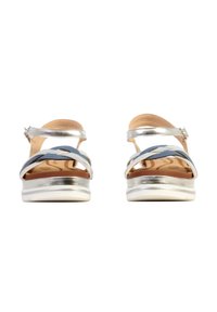 Sandale compensée avec des brides en cuir argenté et bleu, boucle cheville, semelle intérieure marron rembourrée et semelle extérieure blanche rainurée.