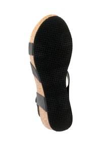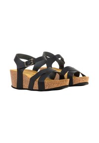 Sandale compensée en cuir noir avec semelle en liège, bride à la cheville et boucle argentée, vue de côté sur un fond blanc.