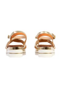Sandales à plateforme dorées et brunes avec des straps entrecroisés, une sangle de cheville réglable et une semelle blanche texturée. Des accents métalliques ajoutent du détail.