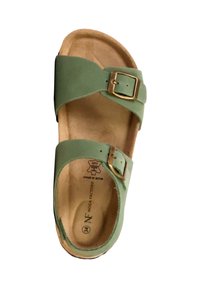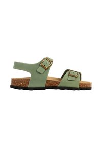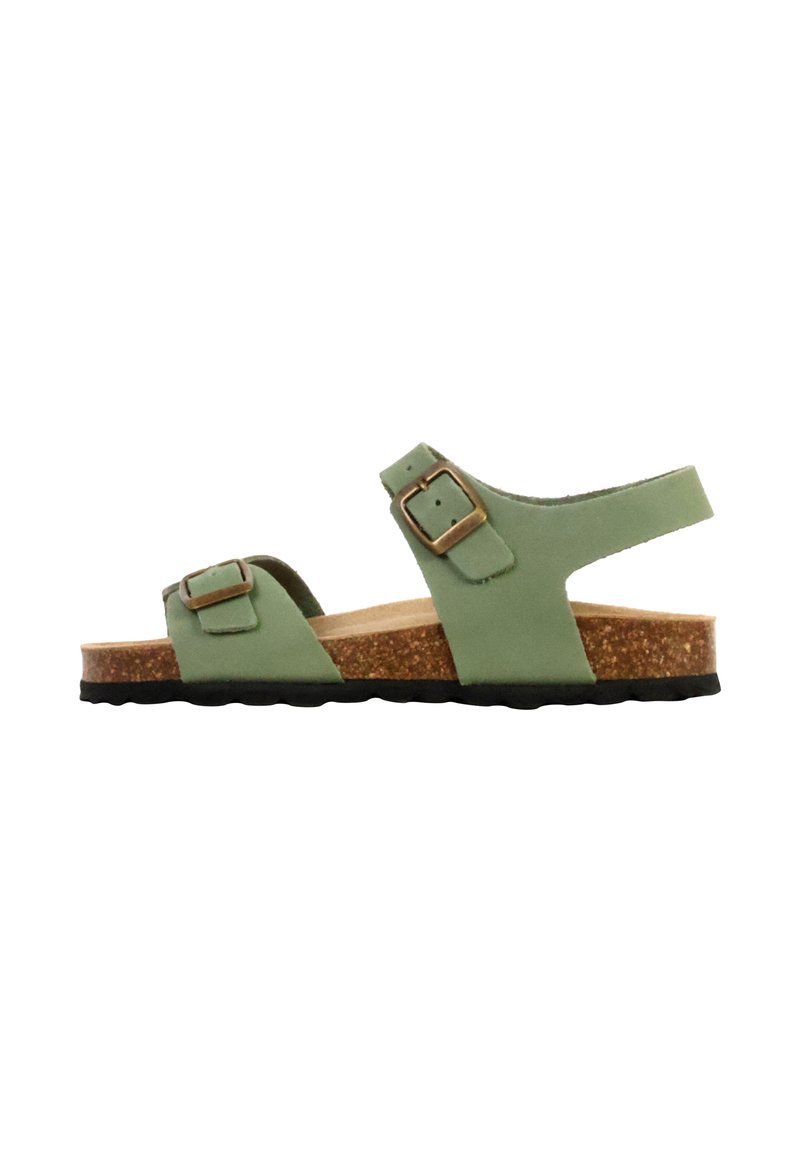 Sandale verte avec semelle intérieure en liège et deux brides réglables avec boucles en bronze, semelle texturée noire, vue latérale sur fond blanc.