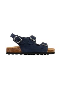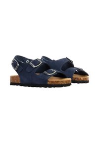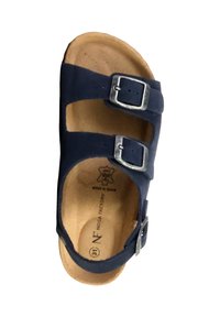 Sandale bleu marine à bout ouvert avec trois brides réglables à boucle et semelle en liège avec semelle extérieure en caoutchouc noir.