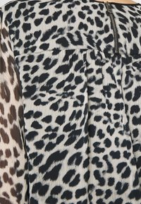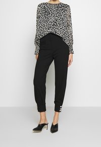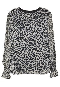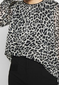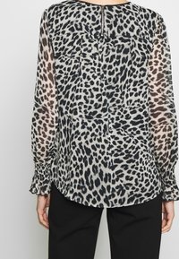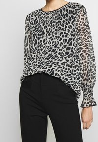 Femme portant un chemisier transparent à manches longues avec un imprimé léopard noir et blanc et un pantalon noir ajusté, debout devant un fond uni.