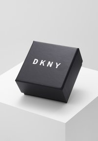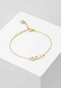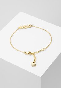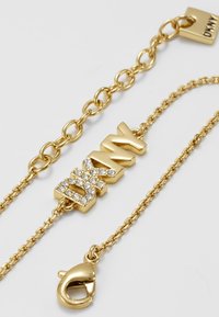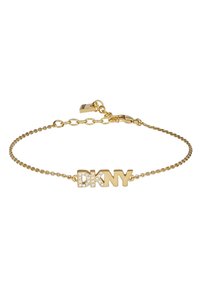 Bracelet chaîne en or avec fermoir et maillons ajustables, arborant le logo "DKNY" orné de petits cristaux clairs, présenté sur une surface blanche.