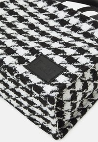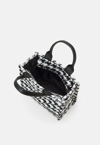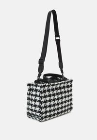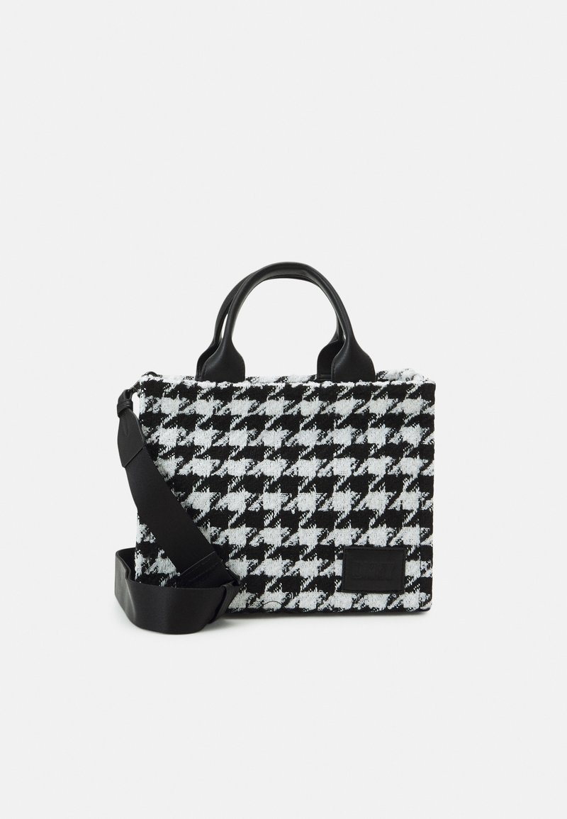 Sac à main à motif pied-de-poule en noir et blanc avec deux poignées courtes et une bandoulière noire amovible sur fond blanc.