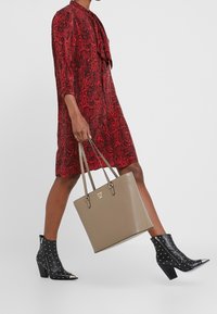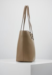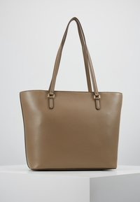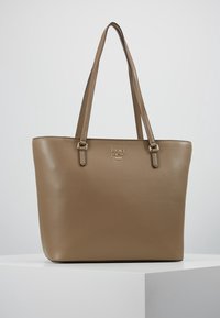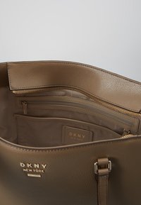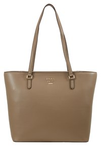 Sac fourre-tout en cuir couleur taupe de DKNY avec deux anses d'épaule, présenté sur un piédestal blanc contre un fond neutre.