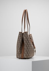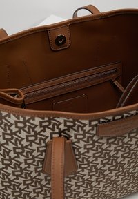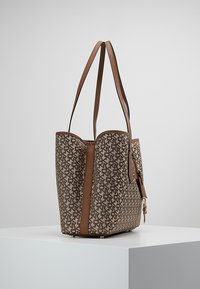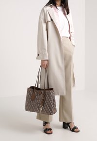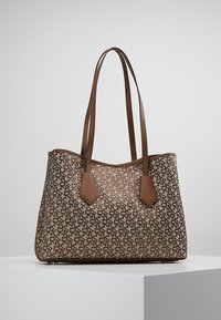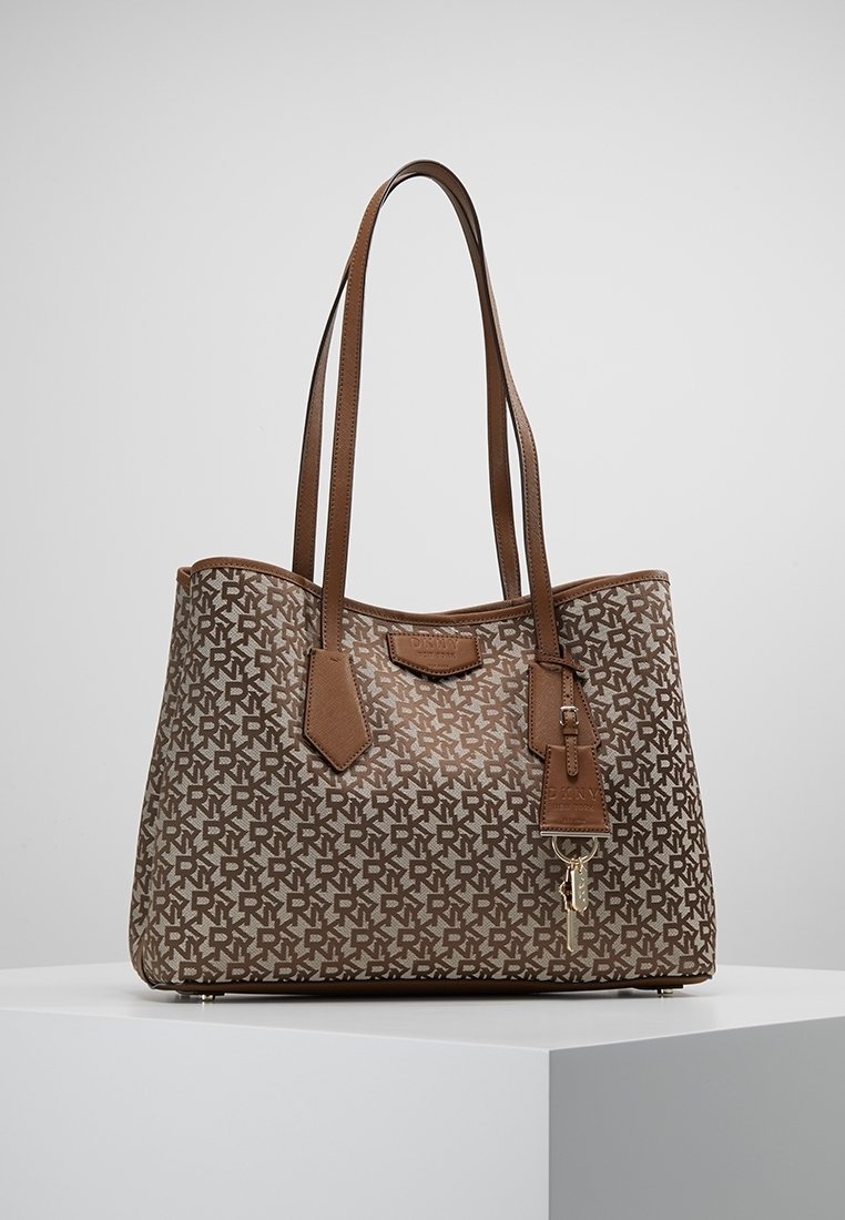 Sac fourre-tout marron DKNY avec motif de logo répétitif, doubles anses épaules, étiquette en cuir et petit porte-clés doré, présenté sur un socle blanc.
