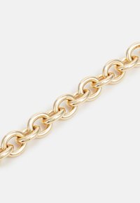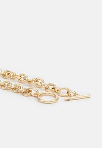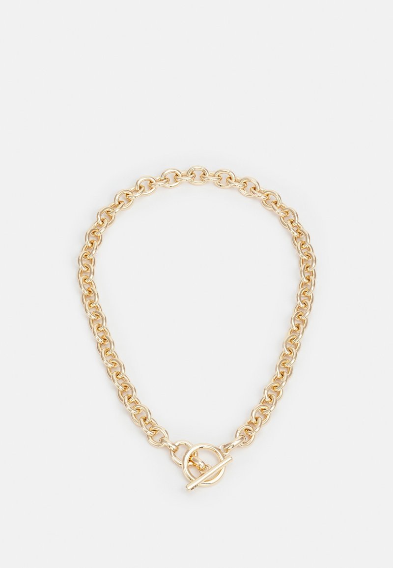 Collier chaîne doré à maillons larges entrelacés avec un fermoir à bascule rond sur un fond clair.