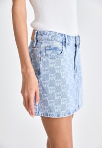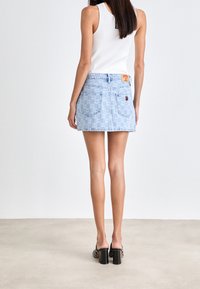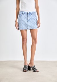 Jupe en denim bleu clair avec un motif discret de logo sur l'ensemble, dotée d'une fermeture à boutons et de poches standards. Associée à des sandales slide noires avec logo.