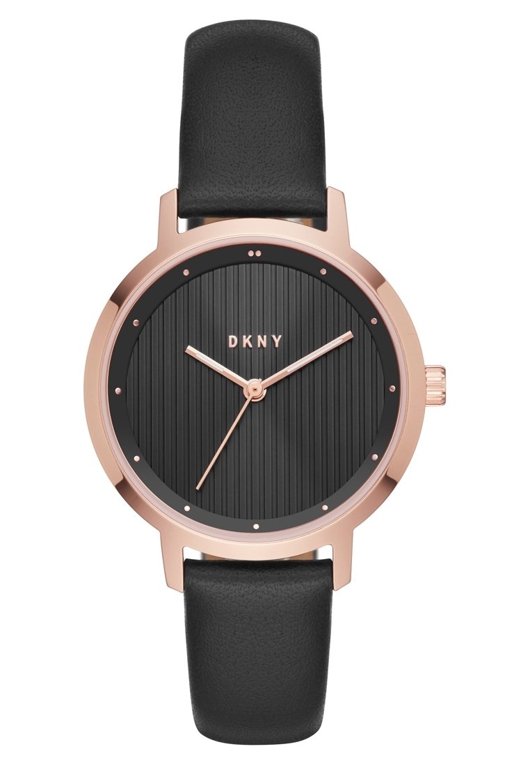 Montre à boîtier rond en or rose avec cadran texturé noir, aiguilles en or rose, points comme index des heures, bracelet en cuir noir et logo DKNY à 12 heures.