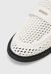 Mocassin en cuir blanc perforé avec semelle noire et talon bas, doté d'une large bride sur le dessus et d'un détail métallique sur le talon.