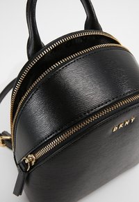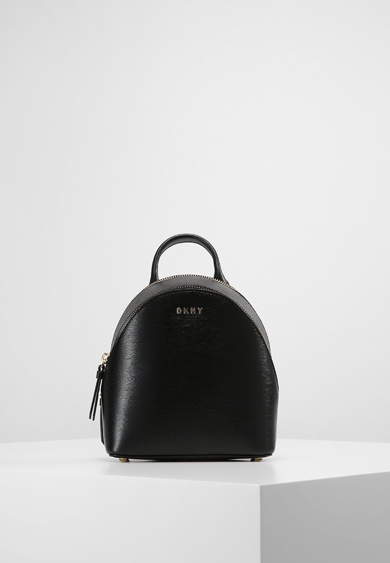 Mini-sac à dos en cuir noir avec poignée supérieure, fermeture éclair dorée et logo DKNY à l'avant, présenté sur un socle blanc contre un fond uni.