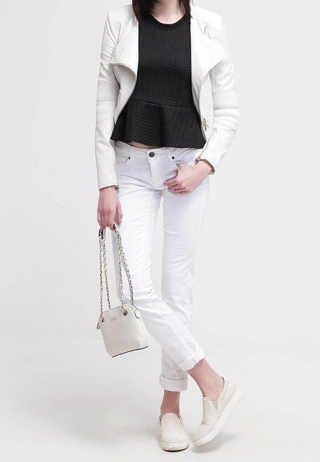 Femme portant un haut péplum noir, une veste et un pantalon blancs, tenant un sac à main blanc, avec des chaussures blanches sans lacets et les jambes croisées.