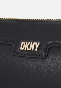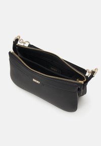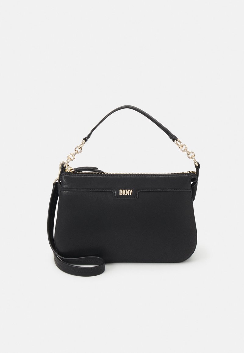 Sac à main noir DKNY avec accents de chaîne dorée, poignée supérieure, fermeture éclair et bandoulière amovible sur un fond clair uni.