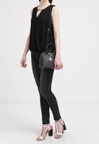 Femme portant un haut noir sans manches, un pantalon skinny noir, des sandales blanches à talons hauts, et portant un petit sac à main noir avec une bandoulière.