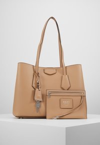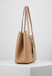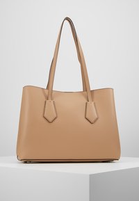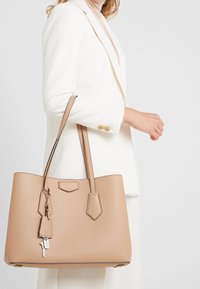 Sac fourre-tout en cuir fauve avec deux bandoulières et une petite étiquette en cuir suspendue tenant une clé en argent, posé sur un piédestal blanc.