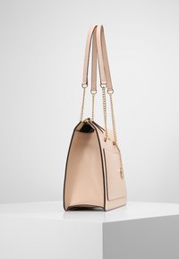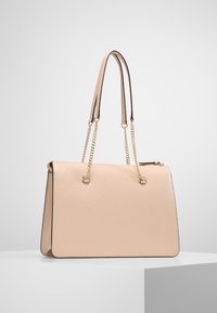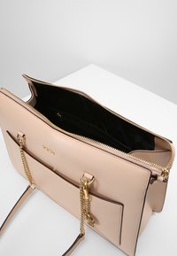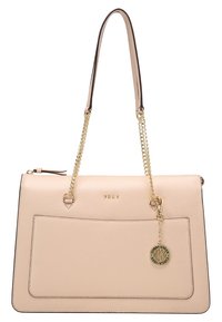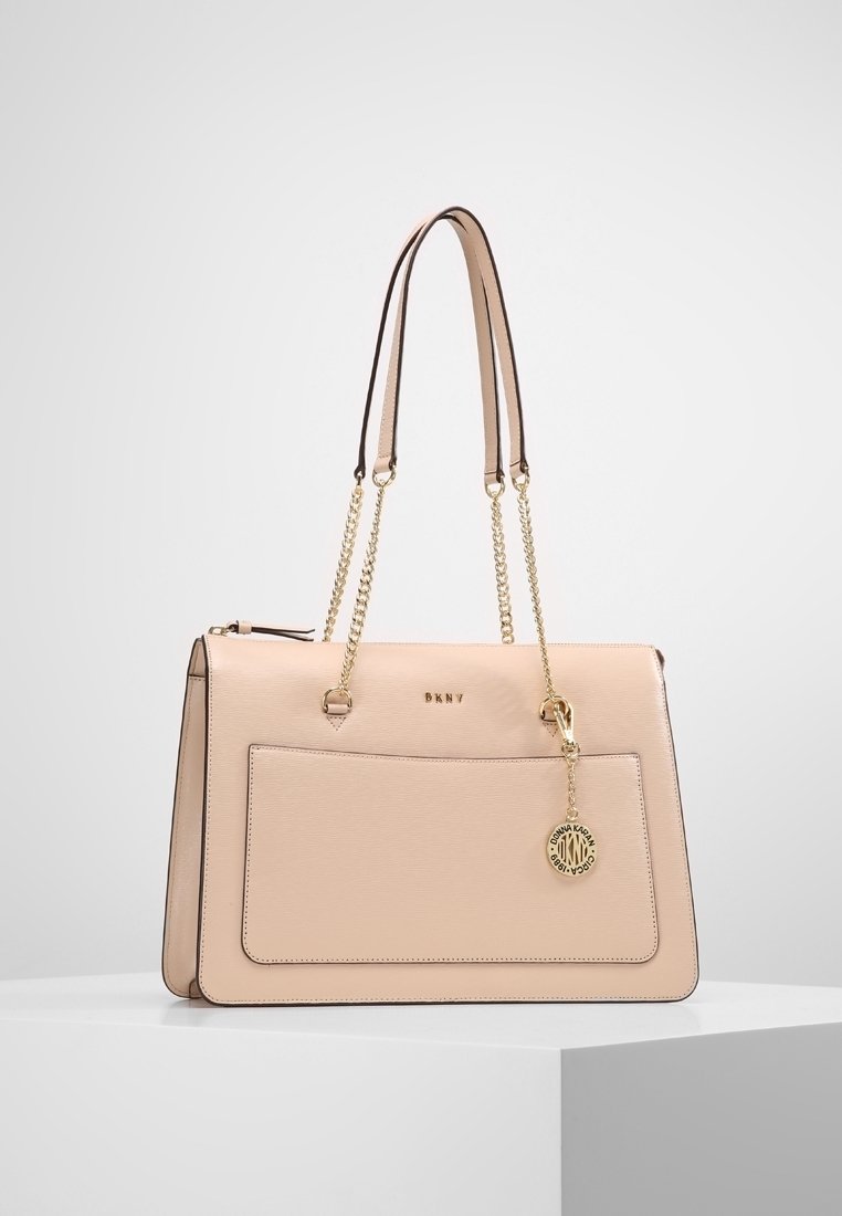 Sac à main en cuir beige DKNY avec doubles anses en chaîne dorée, poche avant et pendentif rond en or avec logo du créateur, suspendu à une surface blanche.