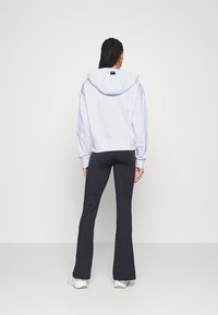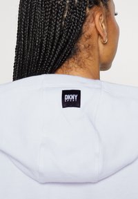 Femme portant un sweat à capuche léger violet clair DKNY SPORT avec cordons noirs et des leggings sombres ajustés, bras détendus le long du corps, sur fond uni.