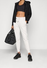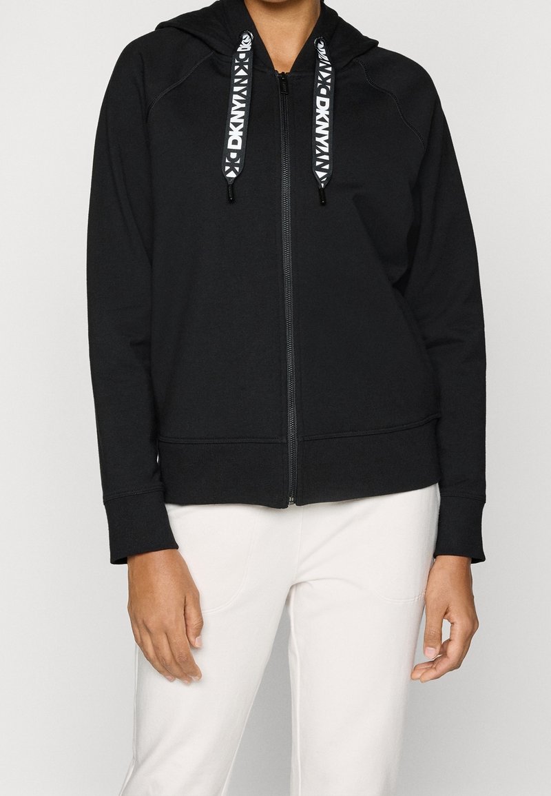 Personne portant un sweat à capuche noir zippé avec des cordons blancs et noirs de marque, et un pantalon blanc, debout les bras détendus.