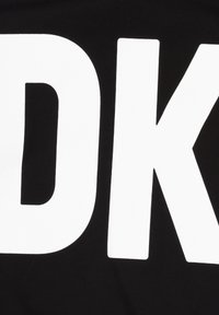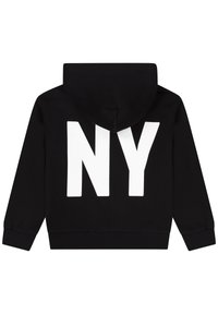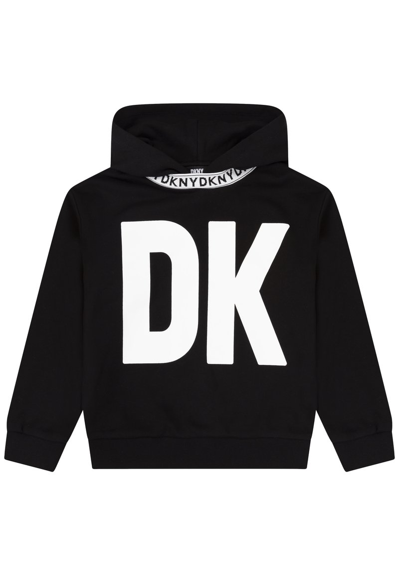 Sweat à capuche noir avec un grand lettrage blanc "DK" sur le devant et le texte répété "DKNY" à l'intérieur de la capuche.