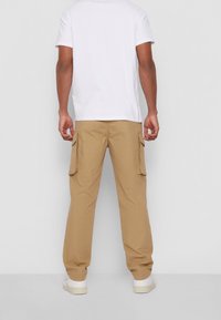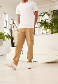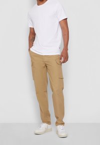 Pantalon cargo beige avec plusieurs poches latérales, coupe droite et détails de couture, associé à des baskets blanches. Matériau en coton durable.