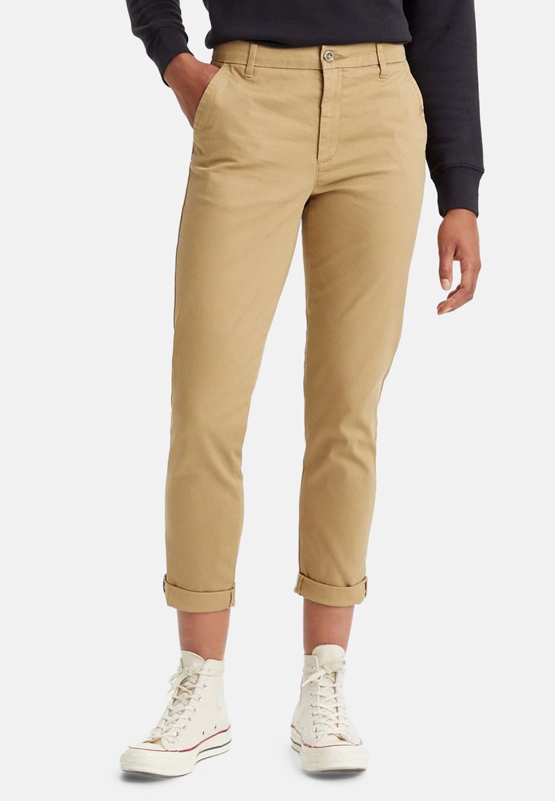 Personne portant un pantalon beige retroussé, une chemise noire à manches longues et des baskets blanches montantes, debout avec une main dans la poche.