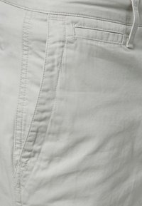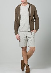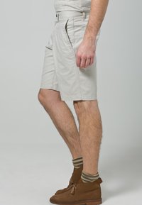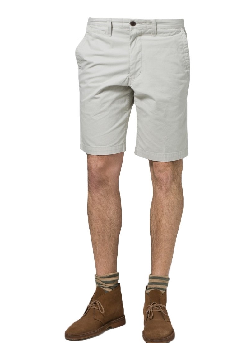 Shorts en coton gris clair avec un devant plat, deux poches latérales et une fermeture à bouton. Portés avec des bottines en daim marron et des chaussettes rayées.