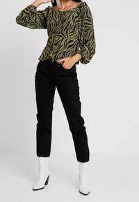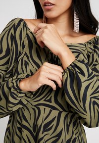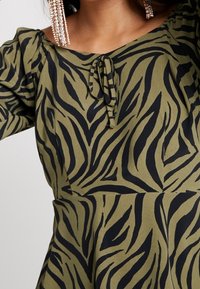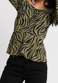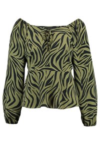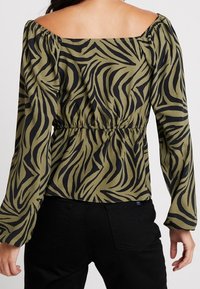 Haut vert olive avec un motif à rayures zèbre noires, présentant un design en peplum, un encolure bateau et un détail à nouer à l'avant.