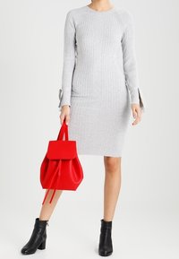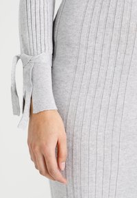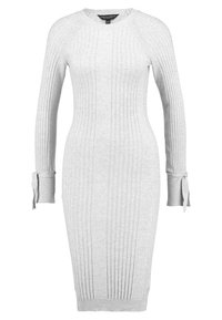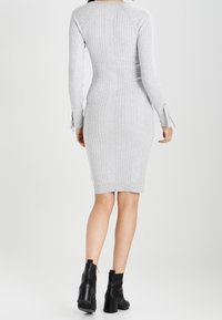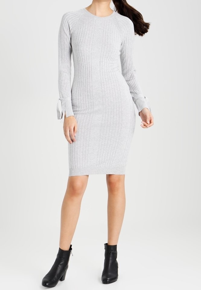 Robe tricotée gris clair à côtes, manches longues, silhouette ajustée et détails de nœuds aux poignets. Portée avec des bottines noires.