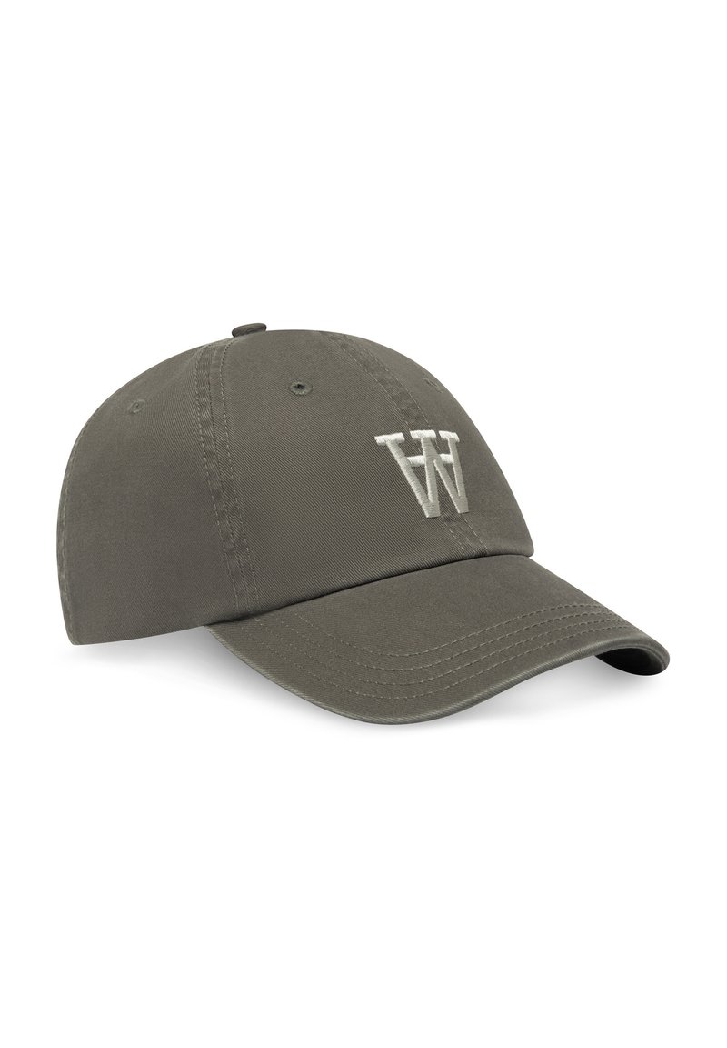 Casquette de baseball gris foncé à six panneaux avec une visière incurvée et une petite broderie blanche "W.W." sur le panneau avant droit.