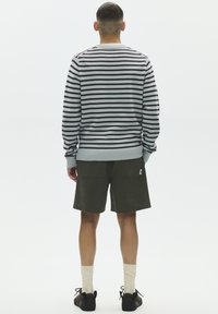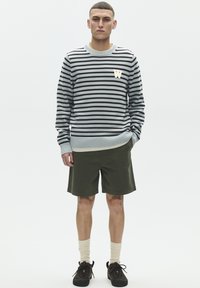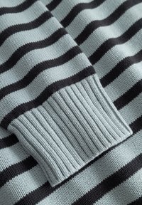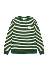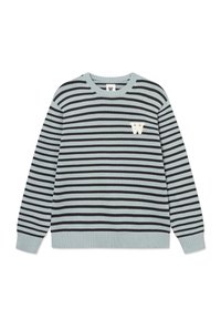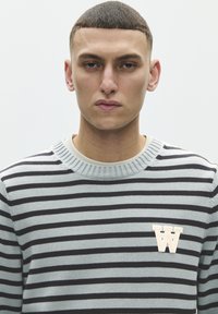 Homme portant un pull rayé gris et noir avec un emblème blanc en forme de "W" sur la poitrine, associé à un pantalon vert foncé, debout devant un fond blanc.