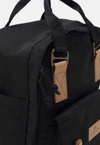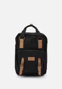 Sac à dos noir avec des sangles et une poignée en cuir marron clair, poche avant avec fermetures à boucle et anneaux en métal reliant les bretelles.